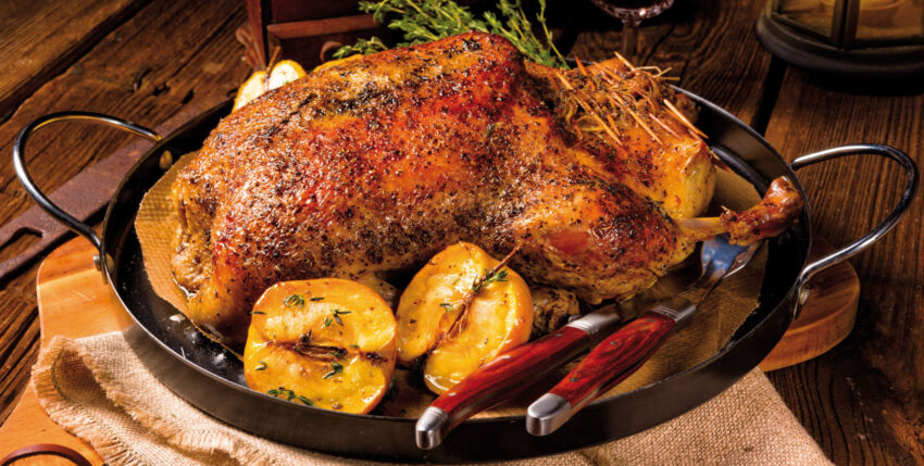 gebraten an Preiselbeer Sauce dazu Macaire -Kartoffeln und Speckbohnen